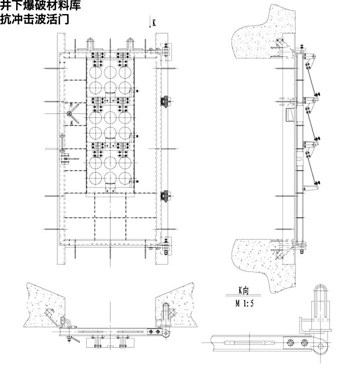 1、本件炸藥庫抗沖擊波活門,抗沖擊波超壓能力為2500kpa,通風活門組分為三組,總通風量為6000m3/h,每組通風量為2000m3/h,風速均按8m/s進行設計的。使用時可根據井下爆破材料庫需要風量和總回風道負壓值,確定通風活門組數,并可調節每組活門懸板的張啟角度進行微調,以滿足***佳通風量。
